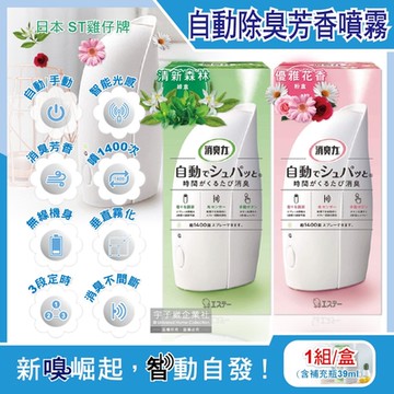 日本ST雞仔牌-室內消臭力智能光感應3段定時無線自動除臭芳香噴霧機1入/盒(含芳香劑補充瓶39ml)