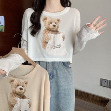 La Belleza圓領趣味小熊圖案印花寬鬆衛衣長版棉質T恤