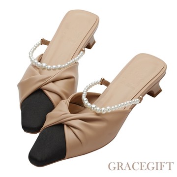 【Grace Gift】薛妞妞聯名-浪漫名媛珍珠低跟穆勒鞋 杏