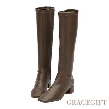 【Grace Gift】rather聯名-修長濾鏡方頭長靴 咖