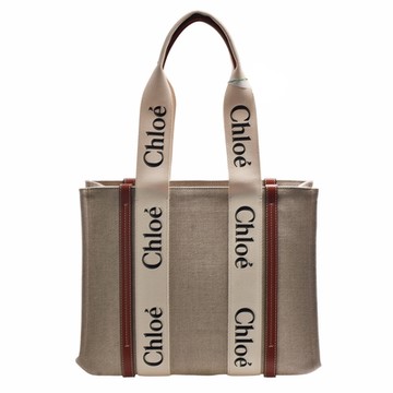 CHLOE-WOODY條槓字母LOGO帆布托特包(米x淺棕)min 款