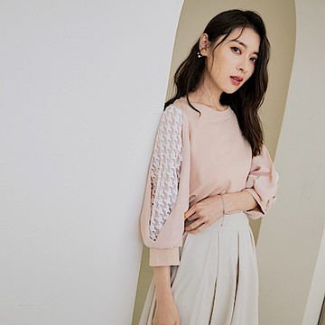 OB嚴選中大尺碼-純色高含棉小立領蕾絲拼接拋袖上衣《AB11242》