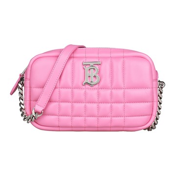 BURBERRY 巴寶莉 Lola 金屬LOGO格紋車線小羊皮斜背拉鍊相機包(天藍 24cm)