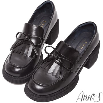 Ann’S重返時光-復古油皮流蘇蝴蝶結厚底粗跟樂福鞋5cm-黑(版型偏小)