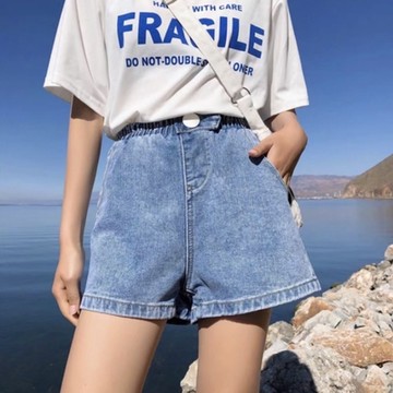 夏季新款熱褲mini brand淺藍色松緊高腰微寬松顯瘦薄款牛仔短褲女