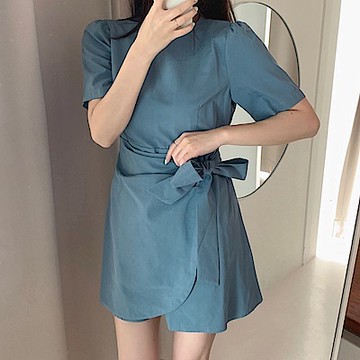 La Belleza韓版圓領背後拉鍊鬆緊腰圍拼接側一片裙擺綁帶不規側短洋裝