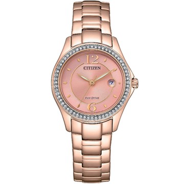 CITIZEN 星辰 母親節推薦款 光動能水晶奢華女錶 百貨周年慶送禮首選-粉橘x玫瑰金 FE1252-82X