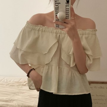 韓國東大門夏款純色木耳邊褶皺露肩泡泡袖顯瘦短款襯衫上衣女裝