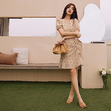 小V臉.V領碎花抽繩荷葉裙襬短洋裝-OB嚴選