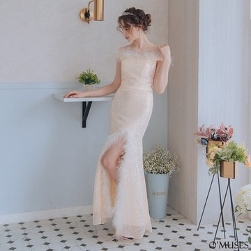 OMUSES 手工一字領羽毛亮片杏色長禮服