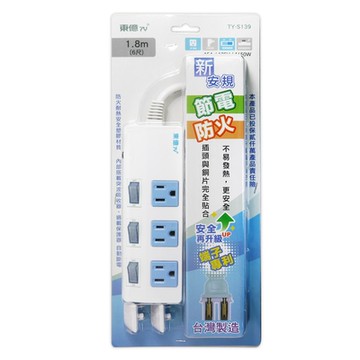 【東亞】3孔1開關3插座2USB延長線_1.8公尺(6尺) TY-S902-6尺