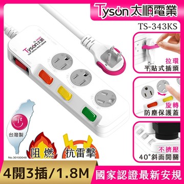 Tyson太順電業 343KS 3孔4切3座防塵蓋延長線(斜面開關/拉環扁插)-1.8M