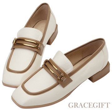 【Grace Gift】逸歡聯名-英倫金屬方頭低跟樂福鞋 卡其
