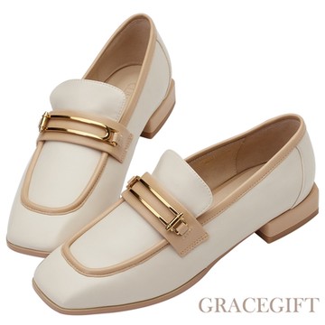【Grace Gift】逸歡聯名-英倫金屬方頭低跟樂福鞋 杏