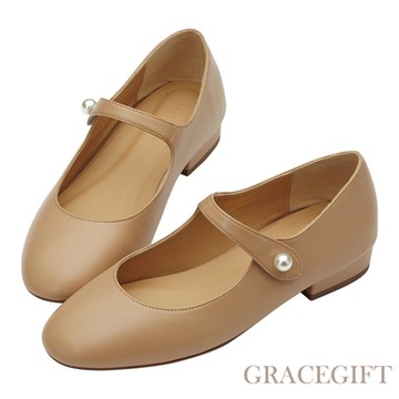 【Grace Gift】甜美氣質珍珠平底瑪莉珍鞋 駝