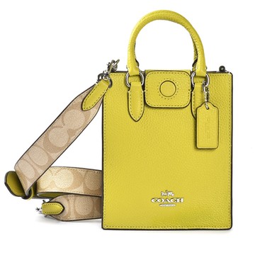 COACH 素面荔枝紋皮革X經典老花C紋手提/斜背兩用迷你直式托特包琴譜包-萊姆綠/卡其色