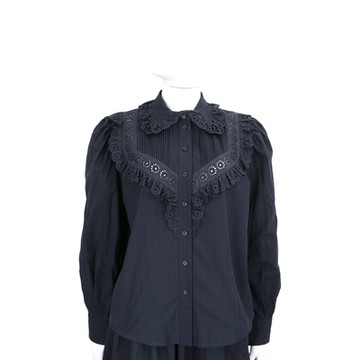 SEE BY CHLOE 簍空雕花飾邊有機棉夜藍色長袖襯衫