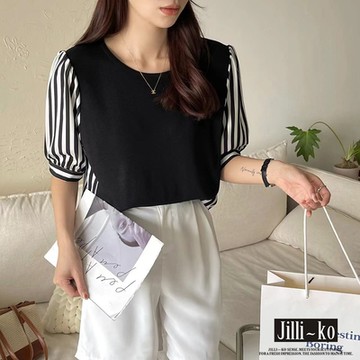 JILLI-KO 條紋燈籠袖拼接後寬鬆設計款上衣 - 黑/卡其