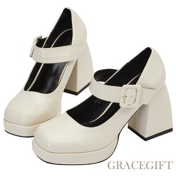 【Grace Gift】目光焦點方頭厚底瑪莉珍高跟鞋 米白
