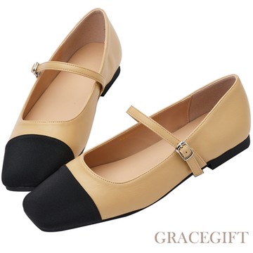 [獨家訂製楦型] 全真皮細帶V口方頭低跟瑪莉珍鞋 杏色