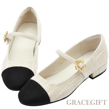 【Grace Gift】珍珠小花條帶魔鬼氈芭蕾舞瑪莉珍鞋 米白