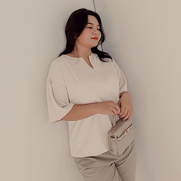 雲朵自訂款-小V領交織布紋拋袖前短後長上衣