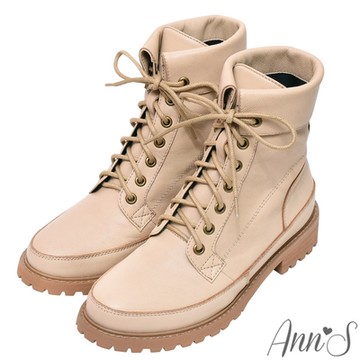 Ann’S近乎平底卻很顯瘦-真皮綁帶軍靴短靴5cm-米白