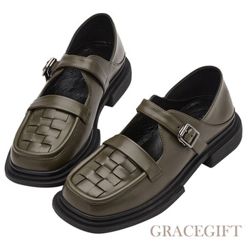 【Grace Gift】逸歡聯名-花樣少女編織瑪莉珍樂福鞋 墨綠