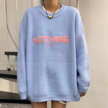 La Belleza韓版圓領絨毛英文字長版厚針織毛衣