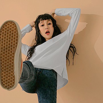 CHIC A SPACE 撞色滾邊線條桃心領抓皺設計長袖短版羅紋上衣(白/深藍) 女裝 現貨