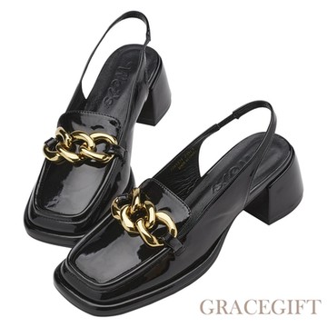 【Grace Gift】唐葳訂製-季節任意門金屬鍊條低跟鞋 黑漆