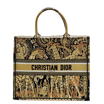 DIOR 迪奧 經典BOOK TOTE系列非洲動物圖騰刺繡帆布手提托特包(大_黑黃色-展示品)