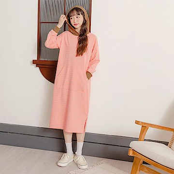 撞色條紋口袋連帽連衣裙/長洋裝-OB大尺碼