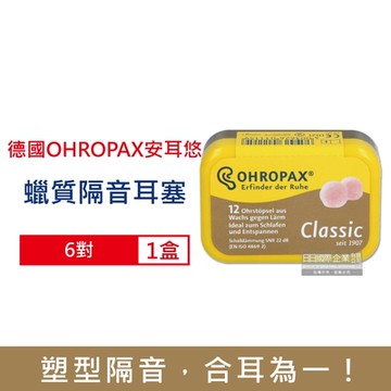 德國OHROPAX安耳悠-Classic柔軟蠟質溫度塑型貼耳式隔音耳塞6對/黃盒(SNR 22dB降噪規格,CE歐盟認證,靜音舒適保護聽力,凡士林親膚耳塞)