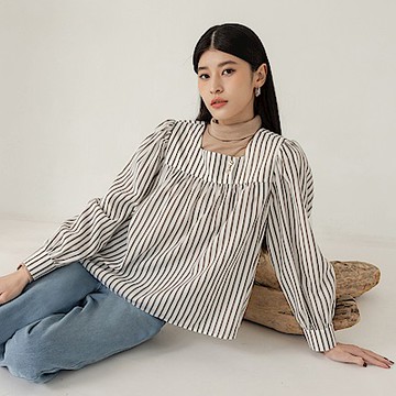 不易皺條紋印花方領長袖上衣-OB嚴選