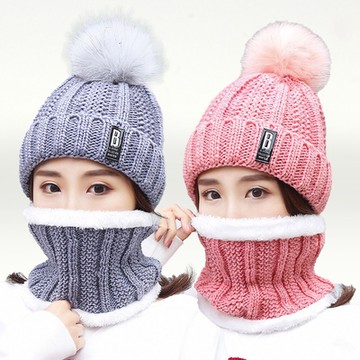 I.Dear-韓版大毛球護耳針織保暖加絨毛線帽圍脖兩件套(6色)