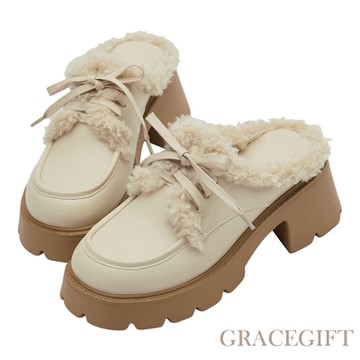 【Grace Gift】紀卜心聯名-萌系少女毛毛厚底穆勒鞋 米白