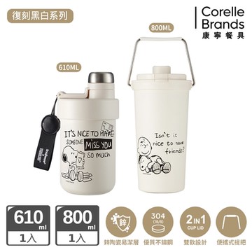 (買1送1)【美國康寧 Snapware】SNOOPY史努比鋅動輕瓷大容量不鏽鋼手提保溫杯800ml+玻璃瓶710ml