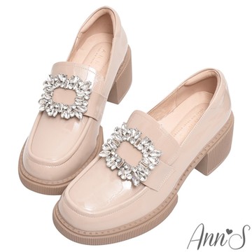 Ann’S優雅學姊-訂製愛心鑽馬銜扣輕量厚底樂福鞋5.5cm-漆皮米(版型偏小)