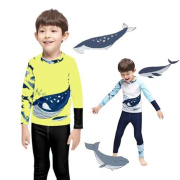 BB8449 不對稱拼接 單邊彩色鯨魚滿印 褲腳拼接更顯整體感 插肩設計肩部不卡卡 3件 長袖上衣+長泳褲+短泳褲