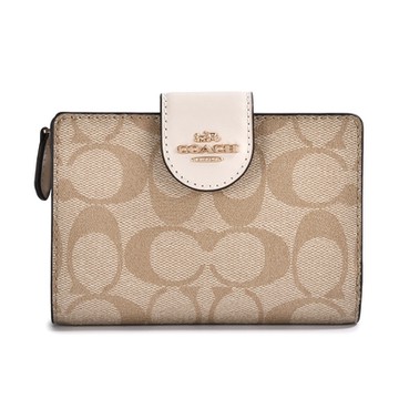 COACH 經典滿版C LOGO PVC防水皮革壓釦中夾-卡其/白色