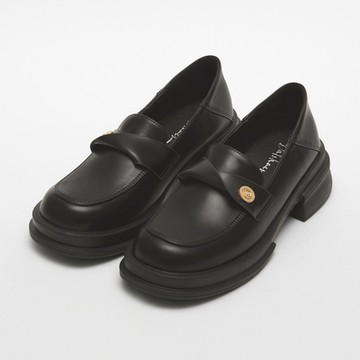 MAGY 小金釦扭結方頭真皮粗跟樂福鞋 黑色 #15783