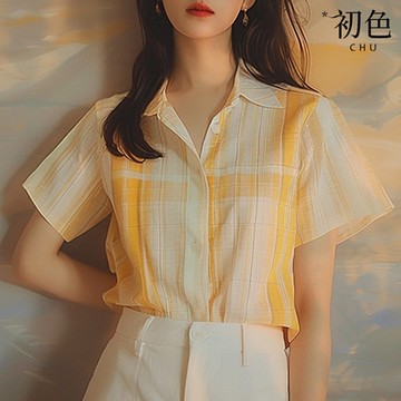 初色 休閒格紋百搭寬鬆顯瘦翻領短袖襯衫女上衣-黃色-33740(M-2XL可選)