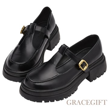 【Grace Gift】率性馬銜扣微厚底樂福鞋 黑漆