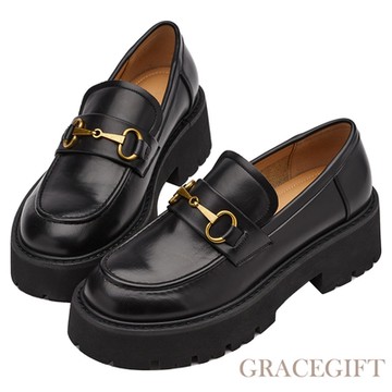 【Grace Gift】率性馬銜扣微厚底樂福鞋 黑漆