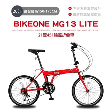 BIKEONE MG13 LITE 20吋21速451輪徑折疊車美感雷射無感貼標塗裝與亮眼的方管車架設計剛性Q度顏值都剛好小型佳作通勤運動代步首選