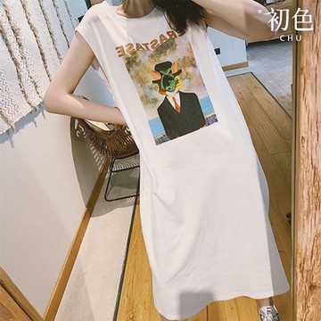 初色 寬鬆文藝印花圓領無袖中長裙連衣裙連身洋裝-白色-33867(M-2XL可選/現貨+預購)