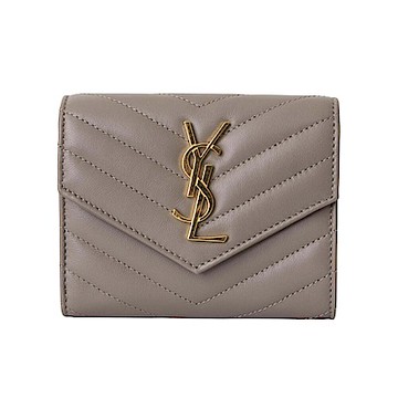 YSL SAINT LAURENT Cassandre 羊皮 三折開釦 短夾 卡夾 零錢包 灰棕色 金色 403943