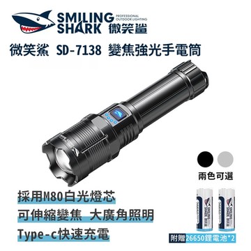 微笑鯊【SD7138 變焦強光手電筒】防水 充電手電筒 露營 登山 釣魚 戶外照明 多功能照明 超亮遠射 爆亮 長續航 行動電源
