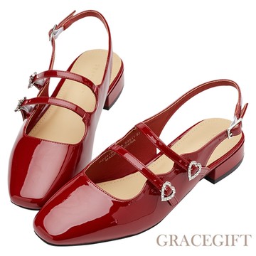 【Grace Gift】方頭雙帶愛心鑽瑪莉珍後空中跟鞋 紅漆